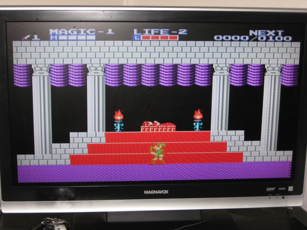 Here we are, embarking on the first leg of our journey. This game is more difficult than any other in the series, but it offers many unique elements right off the bat from its predecessor...and while it introduces several elements to the series that will be seen in every game afterwards, it also plays with elements that will never been seen again. One of the funnest thing, as seen here, is that while Link travels in a top-down overworld; most of the action takes place in side-scrolling sequences. This is the only way to gain experience and to explore new areas as well. As one may have presumed, the area that surrounds the North Palace, the palace where Zelda sleeps and where we begin the game is filled with easy enemies and the game intends for you to grind for awhile to build Link's statistics (see, in this game, unlike any other Zelda, you use experience to gain attack, defense, magic power and then eventually extra lives.) but also intends for you to get irritated with this process fairly quickly, as all of the enemies surrounding the North Palace give little to nothing for experience and like in any RPG, the game forces you to move forward out of sheer boredom with your current surroundings. The North Palace really serves one main purpose: the hub location for the entire game. With the exception being after you have reached the Great Palace, you will always start the game from the North Palace in the chamber where Zelda is locked in her eternal slumber. Incidentally, this is also the location of the final cut-scene of the game but that won't come until much later.