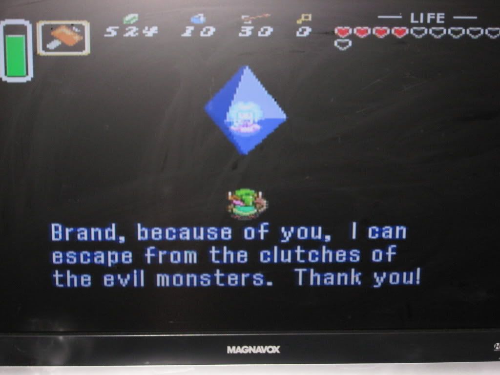 After the King goes down in a fiery death, the first crystal is released to you. Within, you find a maiden who tells you she was trapped within thanks to Agahnim's design. She also tells you lots and lots about Ganon, the leader of thieves, who is responsible for the shape of the Dark World, and then she unleashes the time bomb: that by releasing the other six maidens trapped within the crystals, you will be able to defeat Ganon and restore order to the Golden Land. The true mission of the second half of the game has been revealed to you, now you don't need to worry about being so aimless anymore! You just have to worry about surviving six more dungeons! : )