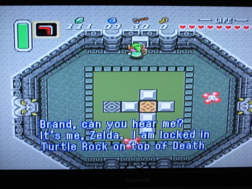 Now that we are in the Dark World, we can no longer communicate with Sahsarahla. Sad day, I know. But despite the fact that she is trapped within the forsaken Turtle Rock, Zelda can still communicate with us and alerts us to her situation and opens the window on the goal of the second part of the quest, which incidentally was the same as the first: to rescue her. This will be the third time we've saved her in this game, so let's go!